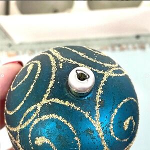 round, peacock blue with swirly gold glitter,