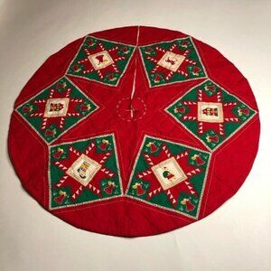 Vintage Christmas Tree Skirt Quilted Red and Green Squares Star Homemade Handmade Santa Claus Rocking Horse Home Sweet Home Stocking Angel