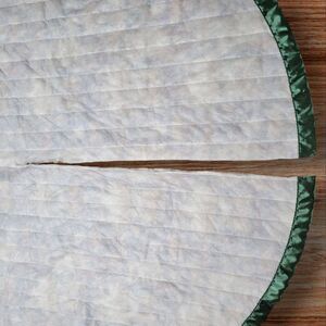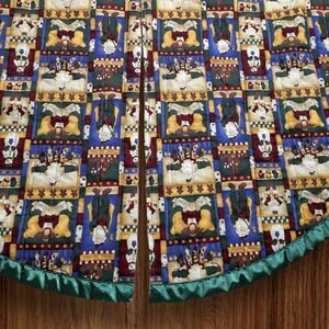 Quilted homemade Christmas tree skirt with festive holiday characters & figures