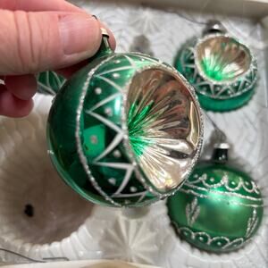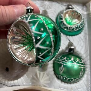 Vintage Christmas Tree ornaments green glass & silver glitter set of 5 in box