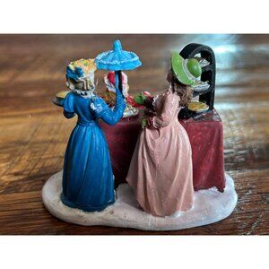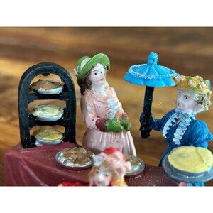 This charming figurine captures a bake sale that’s serious business. Vintage ladies peddle pies with flair, while one holds a sign, ensuring no pie goes unsold.