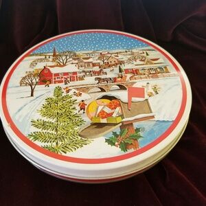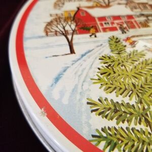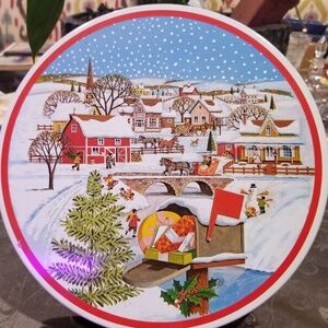 Vintage Christmas Village Scene Tin. Probably from the 80's. Great condition. 1.5" tall x 8.5" wide. Horse & Sleigh, Mailbox full of presents, Wintery Town.