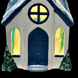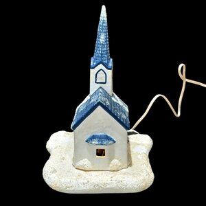 Vintage Christmas Village Snowy Church Chapel 2 Piece Lighted Blue White 11.5"
