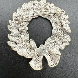 Vintage Christmas Wreath Brooch Pin With Red Rhinestones Green Enamel Bow KC Sig