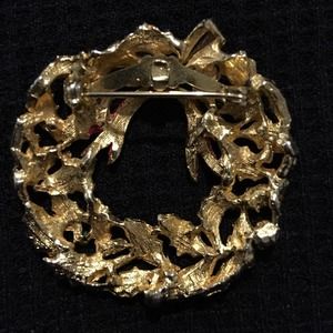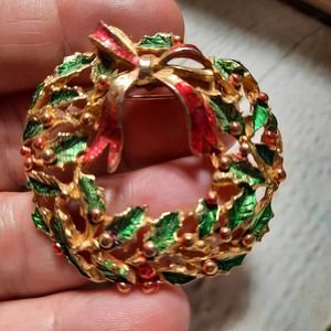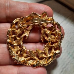 Christmas Wreath Pin Brooch Gold Tone with green and red.