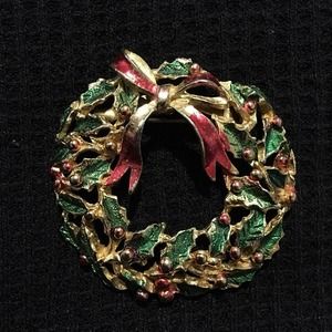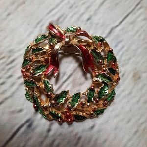 Vintage Christmas Wreath Pin Brooch Gold Tone Green Red