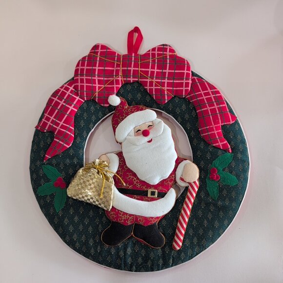 This Vintage Christmas Wreath is a festive and nostalgic addition to your holiday decor. This 12" diameter puffy wreath features a Santa Claus design made from fabric cloth, perfect for adding a touch of whimsy to your home. Manufactured in 1995 in China, this artificial wreath captures the essence of the 1990s holiday season with its colorful and seasonal theme. Ideal for collectors or anyone looking to bring a touch of retro charm to their Christmas decorations.