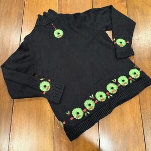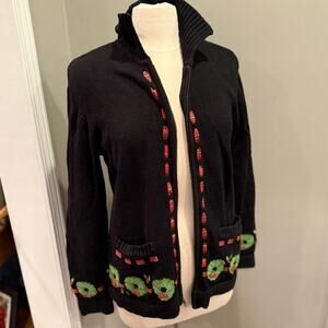 Vintage Christmas Wreath Zip Sweater Plaid Ribbon Applique Beaded Sz Lrg Black