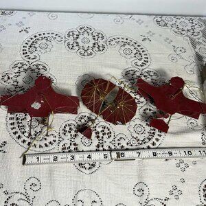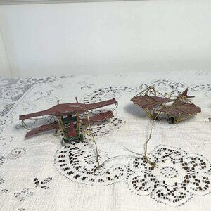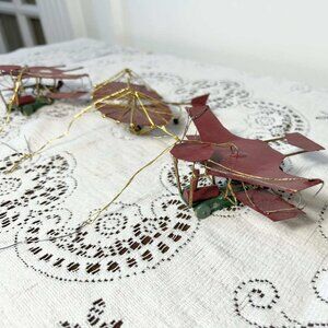 Order is for (3) old fashioned red, green and gold metal biplane Christmas Holiday ornaments. Some of the dark red paint is chipped and one of them is missing a tail piece. 4” to 4.5” wide.