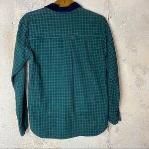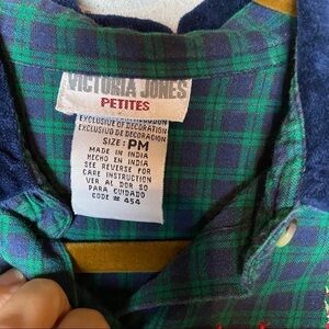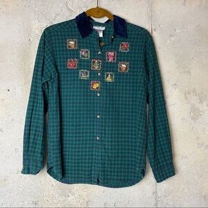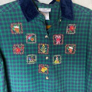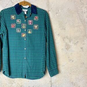 Vintage Victoria Jones green and navy plaid button down long sleeve top with embroidered Christmas items across the chest. Navy velour collar. Great work as a ugly Christmas outfit paired with a gaudy vest or tucked into high waisted jeans for a chic, trendy look