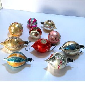 This is a beautiful set of 10 vintage indented hand painted Christmas balls; they are 3", 2 1/2" the caps are not marked - these are absolutely gorgeous and getting so hard to find; I have a lot of great Christmas items listed and more to come so please check back. There is some loss of color and show of wear on some; please see pics.