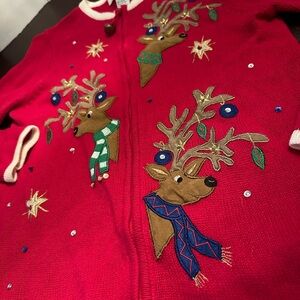 Adorable zip front Christmas sweater from tiara international Christmas collection. Zipper has a bell. 3 ornamentally adorned reindeer with beads and sequins.