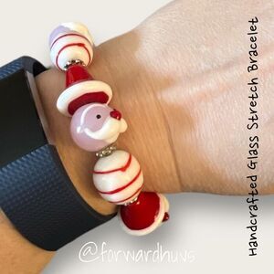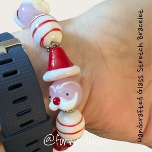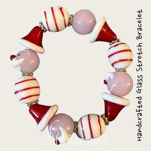 This listing is for a really fun hand made glass Santa bracelet with 3 unique and handcrafted bead styles. There is a Santa face bead, a hat bead and a white with red swirls body bead. Each is separated by a silver colored spacer bead. This is adorable, has not been overstretched and is festive!