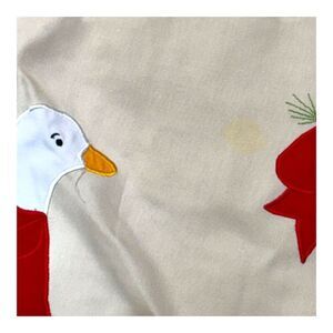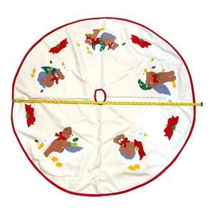 This vintage tree skirt adds a charming touch to holiday decor. Its embroidered design features festive geese and bears, providing a nostalgic Christmas look. Made from a cotton blend, it is both durable and decorative. Suitable for medium to large-sized trees, enhancing any festive setting.