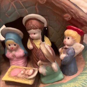 Embrace the spirit of the holiday season with this exquisite vintage clay/ceramic nativity scene, featuring a harmonious blend of blue, green and brown hues. This beautifully crafted piece captures the essence of traditional holiday decor, making it a perfect addition to your festive home display.