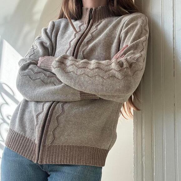 Vintage Christopher & Banks Beige Knit Zip Front Sweater w/ Shoulder Pads
