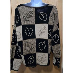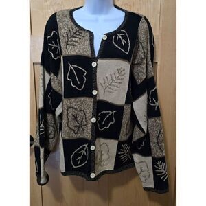 Vintage Christopher & Banks Leaf Pattern Cardigan Sweater Black & Tan Hand Embro