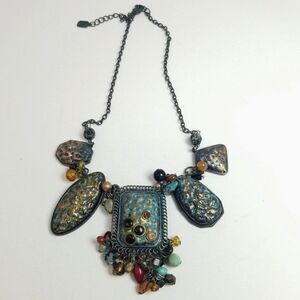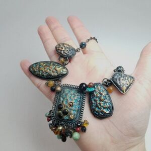 Vintage Chunky Boho Black and Blue Collar Necklace, Beaded Fringe, Bold