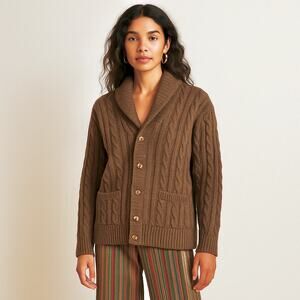 A rich, rugged heritage charm, featuring a thick cable knit texture, shawl collar, and tortoiseshell-style buttons. Slouchy Eclectic Grandpa Style with front pockets and ribbed cuffs for warmth and shape. Earthy brown tone.