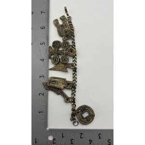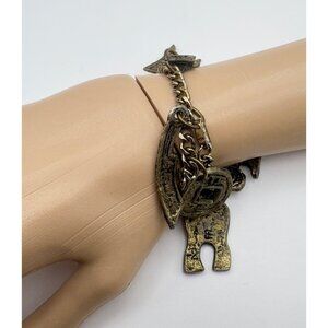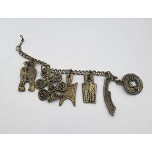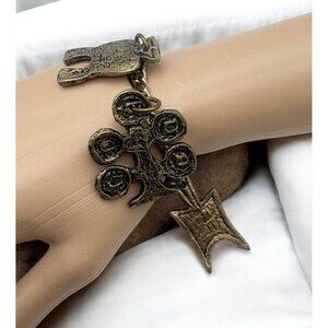 This bracelet features a series of abstract bronze charms with intricate details, offering a distinct and artistic accessory for any wardrobe.