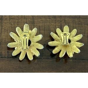 These vintage clip-on earrings are a charming addition to any jewelry collection. The chunky design features a delightful daisy flower shape, with a goldtone clip-on closure for easy wear. These earrings are signed and boast a vintage charm, perfect for any fashion-forward woman. The earrings are in a great shape and have a beautiful golden color that will complement any outfit.