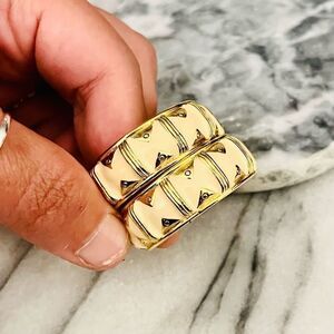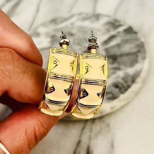 Vintage Chunky Enamel Hoop Earrings Cream Gold Toned Metal Stud Large Statement