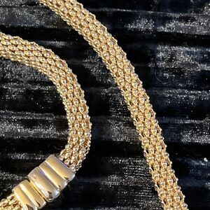 This Vintage Chunky Goldtone Mesh Chain Magnetic Front Clasp Necklace & Bracelet Set exudes beauty and glamour with its elegant design. The gold color and chunky mesh chain add a touch of opulence, while the magnetic front clasp makes it easy to wear. This set includes both a necklace and bracelet, perfect for creating a cohesive and stylish look. The vintage nature of this jewelry set adds a timeless charm to any outfit, making it a must-have for anyone who appreciates classic and elegant pieces.