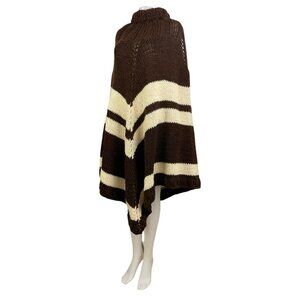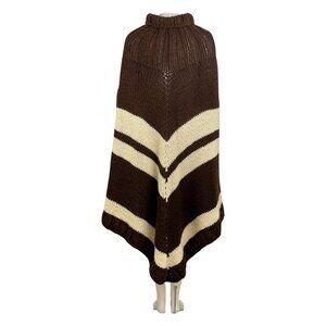 Vintage Chunky Hand Knit Poncho 1970s Brown & Cream Crocheted Acrylic Turtleneck