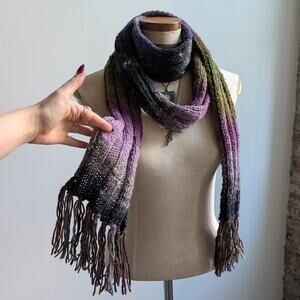 Super witchy & super cute! Love love love this gorgeous longline handknit wool blend scarf. Y2K whimsygoth fairycore romance babe does 90s indie sleaze grunge girlie vibes. Gorgeous rich jewel tones in olive green, eggplant purple, forest green and earthy blue with soft ombre stripes. Perfect chunky knit with sexy shag fringe trim. Super stretchy, perfect for layering and all season wear. Casual and cozy. Gently used, in excellent condition.