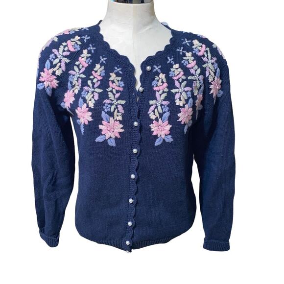 Vintage Chunky Knit floral embroidered applique cardigan sweater scalloped hem pearl buttons size small navy blue, sewn in shoulder pads size small. Worthington Essentials brand.
