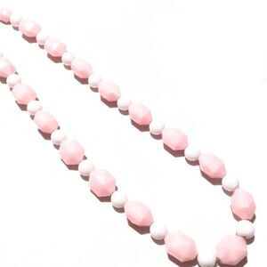 This fun and playful mid century necklace is a bold throwback to retro style. Fashioned in a mix of pale pink and white plastic beads, it features large faceted pink beads paired with smooth white rounds for a striking contrast. The chunky design measures 28" in length and approximately 3/4" in width, making it a standout piece. It fastens with a classic spring clasp and is in great vintage condition—perfect for adding a pop of color and charm to any outfit.
