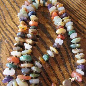 Unsure of origin, but made in the 1970's, this beautiful multi gem necklace measures 28.5". Made of Quartz, Jasper, Agate and possibly other minerals.