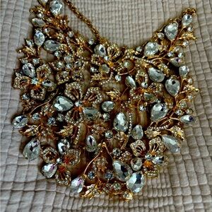This Vintage Chunky Necklace features a stunning amethyst glass crystal statement piece with gold and white color accents. The necklace is 15 inches long and has a hook closure, making it perfect for occasions like engagements, Mother's Day, Christmas, anniversaries, birthdays, christenings, and Valentine's Day. Handmade in the United States, this unique piece has a vintage charm with an oval-shaped main stone and a channel-set design, adding a touch of elegance to any outfit.