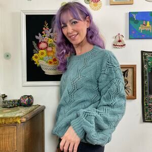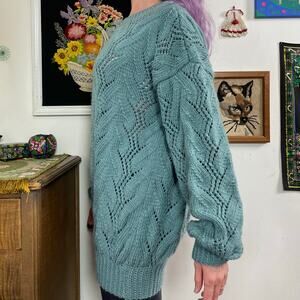 Vintage Chunky Oversized Sweater, 1970s Hand Knit Blue Crewneck, OS Plus Sz