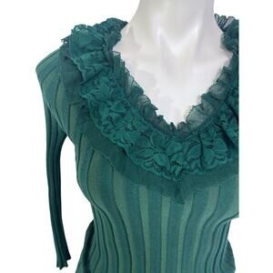 This dark green ribbed knit top features a romantic lace ruffle neckline that gives off a vintage-inspired, feminine vibe. The slim fit and textured knit make it flattering and easy to style. Perfect for layering under blazers, dressing up with skirts, or pairing with jeans for an elevated casual look. A versatile piece for fans of romantic, Victorian-inspired, Whimsigoth, or Dark Academia aesthetics. Silk blend.