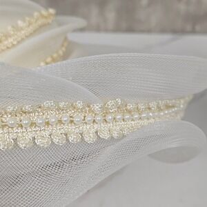 A vision of timeless elegance, this cream-colored hat exudes sophistication and grace. The hat features a unique, tiered design adorned with delicate pearl beading and intricate lace trim, creating a stunning visual texture. A sheer veil adds an ethereal touch, enhancing its formal appeal. This hat is perfect for completing a polished look at weddings, church services, or any special occasion where you want to make a memorable statement.