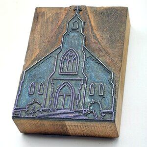 Authentic vintage letterpress printing block featuring a beautifully detailed Gothic-style church with steeple and arched windows, originally used by a local newspaper printing company in Iowa that has since gone out of business.