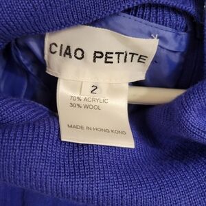 Vintage Ciao turtleneck sweater dress in beautiful cobalt blue. Cableknit pattern on the top, gorgeous vintage intricate buttons going down the skirt. Light wear, some light pilling, generally in very good vintage condition.