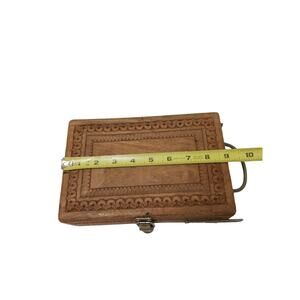 Beautiful hand carved, natural aged wood. The brass handle and hardware show natural aged patina, wear, rubs. The sponge lining is old but not flaking.