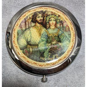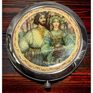 Beautiful and sparkly vintage Russian couple double compact mirror by Cindy. It's in a smooth, shiny silver tone metal. It has a push button latch, two mirrors on the inside, and the rim on the inside is signed Cindy. The front has a drawing of what appears to be a Russian couple in traditional dress, standing in the woods. It has a decorative trim, and has sparkly glitter accents. The back still has its protective film attached.