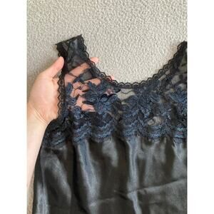 Vintage Cine Star Tank Top Small Satin Lace Round Neck Black Slip Cami Goth Y2K