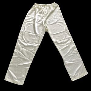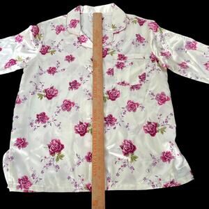Ivory/ cream colored pants with an elastic band and a long sleeved matching, button front top with floral/ rose pattern loungewear pajamas
