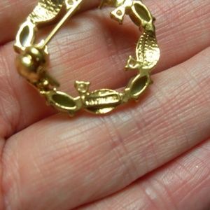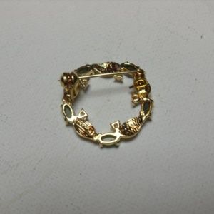 Green Jade brooch, crystal accents, gold tone mixed metal, marked Made in Taiwan 1 inch in diameter, excellent vintage condition.