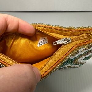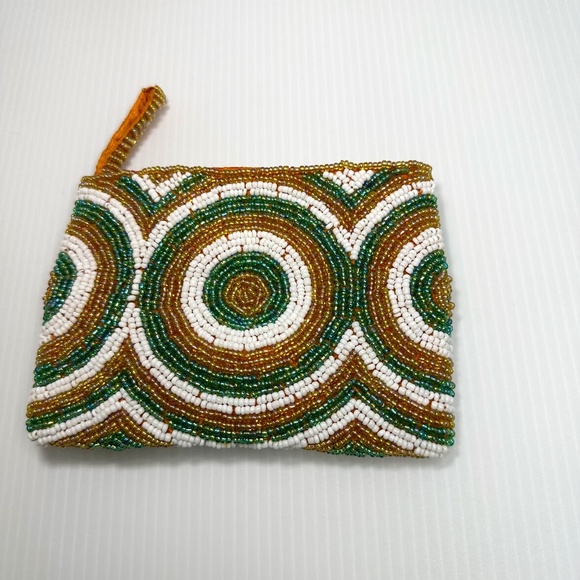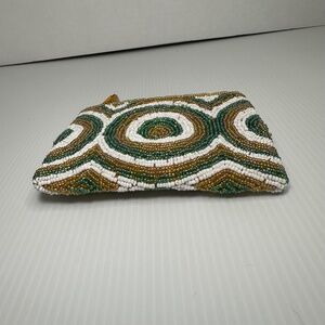 Vintage Circle Hand Beaded Wristlet Clutch/Coin Purse 5.5 in x 4 in Tan, Green
