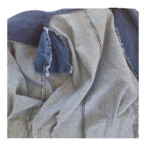 Dolman Sleeve, Deep V, 3-button closure, denim shoulder pads (tacked, can easily be removed). Weighty thick blue jean denim cotton twill.