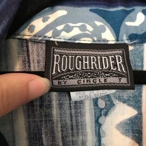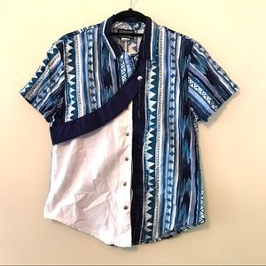 Vintage Roughrider by Circle T Asymmetrical Blue and White Western Buttonup Shortsleeve Top. Made in USA. 100% Cotton. Women’s Sz Medium.
