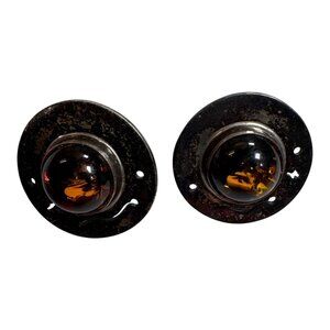 Timeless vintage clip-on earrings featuring amber-colored resin centers set in sturdy metal backings. Ideal for collectors or statement accessory enthusiasts.