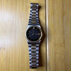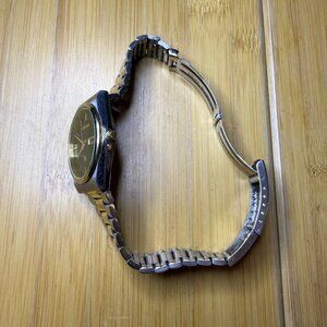 Great cosmetic condition, light wear as shown! This model is not running. It has a two-tone gold and silver metal oyster-style bracelet and case. The dial is black with art deco-style gold tone accents and a day date indicator. Water resistant. Box not included