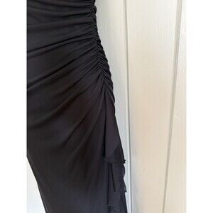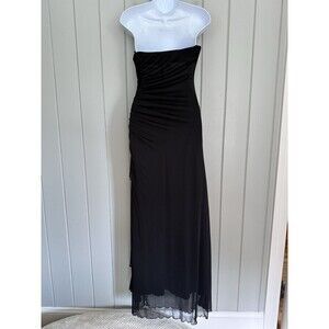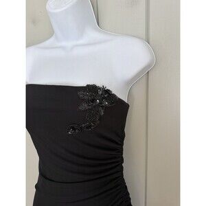 Vintage prom dress maxi strapless gown from City Triangles, estimated to be a size S/XS. Black knit mesh, side ruffle, ruching, beaded floral applique at bustline, lined. Ideal for gothic, fairy goth, grunge, 90s, and Y2K vibes.