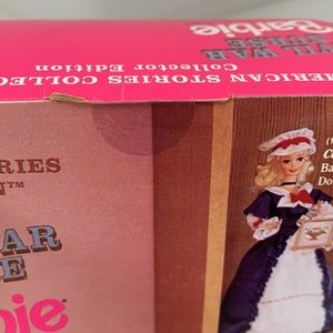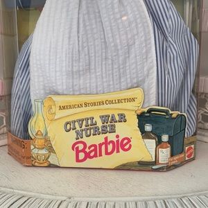 American Stories Civil War Barbie in excellent condition. Box has original seals in tact but I did notice a spot on the front plastic where I could slide my finger in. Probably could add a tact of glue or double sided tape to completely seal it in. It’s not noticeable unless handling it. Doll comes with small story book and cute medical bag. Feel free to ask questions and offers welcome. :)